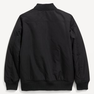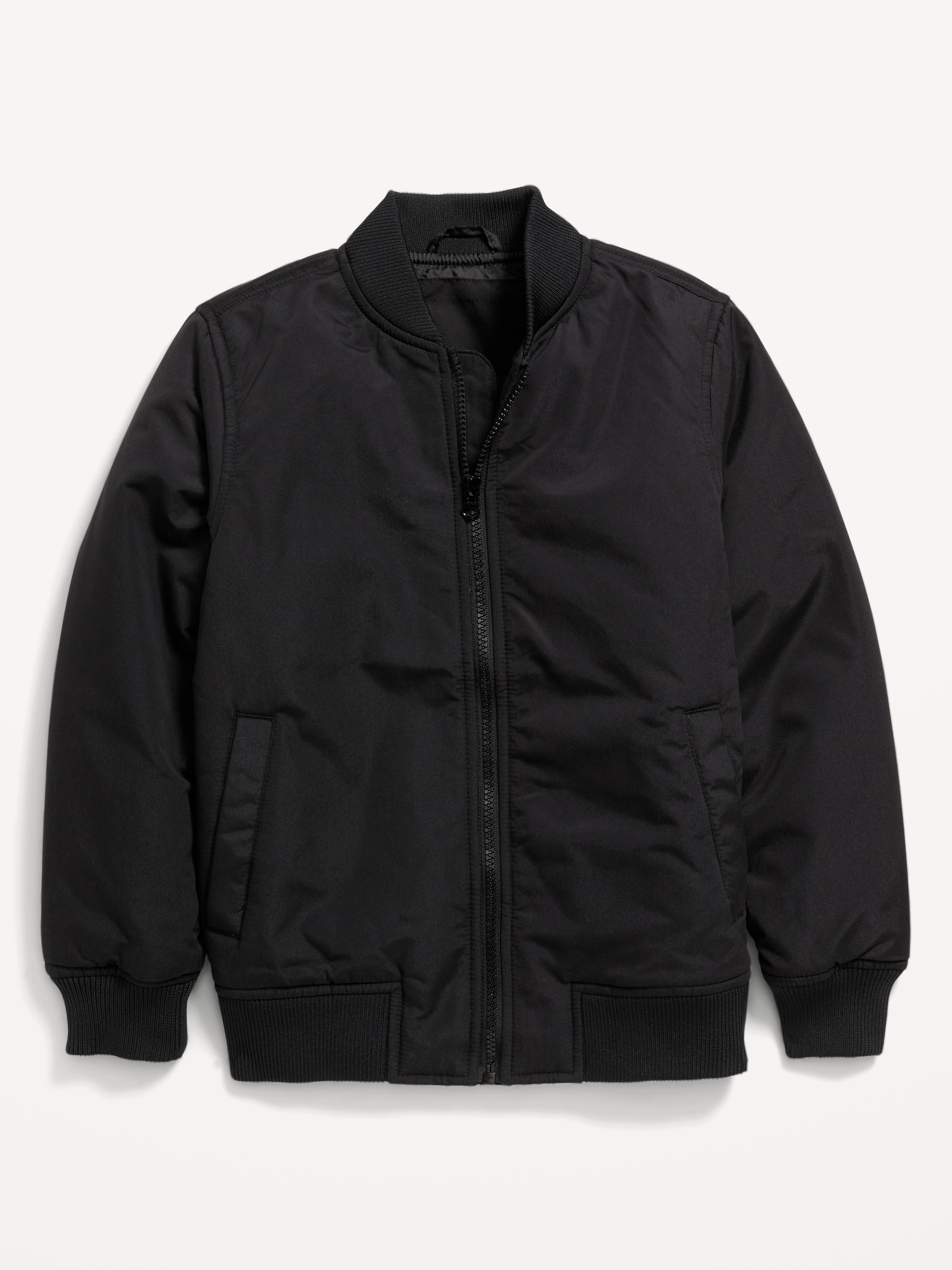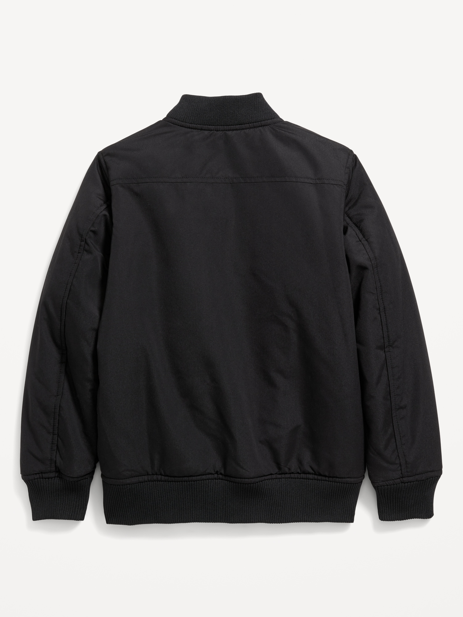 Zip-Front Bomber Jacket for Boys: standing rib-knit collar, long sleeves, full-length zipper, diagonal welt pockets at front, embroidered patch, rib-knit hem, #863154
